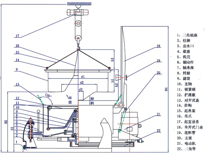 電動(dòng)機(jī)帶動(dòng)轉(zhuǎn)鼓旋轉(zhuǎn),物料由頂部進(jìn)料管加入轉(zhuǎn)鼓,在離心力作用下趨向轉(zhuǎn)鼓,其中液相穿過濾布和鼓壁濾孔排出。固相截留在轉(zhuǎn)鼓內(nèi),停機(jī)后啟開機(jī)蓋松開攔液板鎖緊銷,用起吊裝置將攔液板連同裝有濾渣的濾袋一并吊往卸料處,松開特制的吊爪使濾袋一端開口張開,濾餅便自動(dòng)落下。