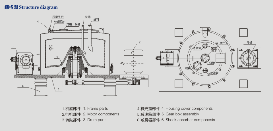 平臺式結構,外殼與平臺焊接為一體,殼蓋與殼體采用法蘭配合快開式結構,殼蓋的開啟采用機械平衡器助力,殼蓋上設置加料管、清洗管、視鏡、觀察燈、透氣孔等。