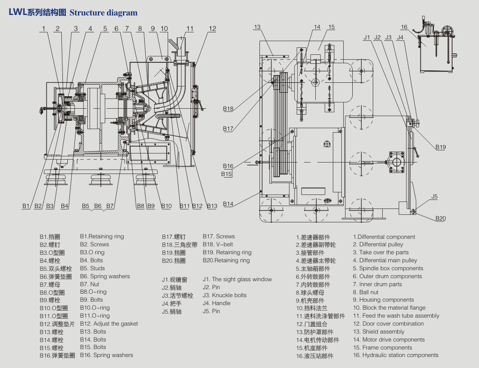 LWL型離心機(jī)是一種臥式螺旋卸料、連續(xù)操作的過(guò)濾設(shè)備。轉(zhuǎn)鼓與螺旋以一定差速同向高速旋轉(zhuǎn),物料由進(jìn)料管連續(xù)引入輸料旋內(nèi)筒,加速后進(jìn)入轉(zhuǎn)鼓,在離心力場(chǎng)作用下,液相穿過(guò)過(guò)濾介質(zhì)排出機(jī)外,固相物截留在轉(zhuǎn)鼓內(nèi)形成濾渣,濾渣在離心力的錐面分力和輸料螺旋的共同作用下,連續(xù)不斷地向轉(zhuǎn)鼓大端移動(dòng)排出轉(zhuǎn)鼓,經(jīng)卸料槽排出機(jī)外。本機(jī)能在全速運(yùn)轉(zhuǎn)下連續(xù)進(jìn)料、分離、洗滌和卸料。具有結(jié)構(gòu)緊湊、體積小、連續(xù)操作、運(yùn)轉(zhuǎn)平穩(wěn)、適應(yīng)性強(qiáng)、處理量大、濾餅含濕率低等特點(diǎn)。