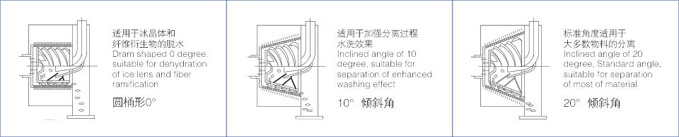 為了減少固態(tài)物的排放阻力,過(guò)濾筒有一定的傾斜角度(脫水角度)。利用傾斜角度和螺旋葉片,減少了固體排放阻力。不但極大的提高了其排放效率,而且具有耗電量低,處理量大的優(yōu)點(diǎn)。